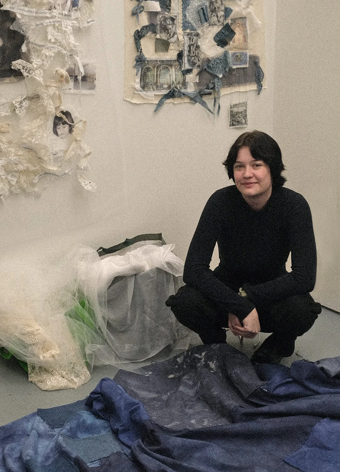 Lily Crocamo (b. 2001) is an artist and graphic designer from Baltimore, Maryland, working in the DMV area. She utilizes textiles and other mixed media to investigate the significance of religion and spirituality to the human experience, and how various theological phenomena impact secular aspects of humanity. She is fascinated with how the tedious, repetitive nature of textiles embodies these concepts physically. Her work also explores the lived experiences of queer and neurodivergent people, and how their identities impact their relationships with themselves, other people, and the physical world around them.